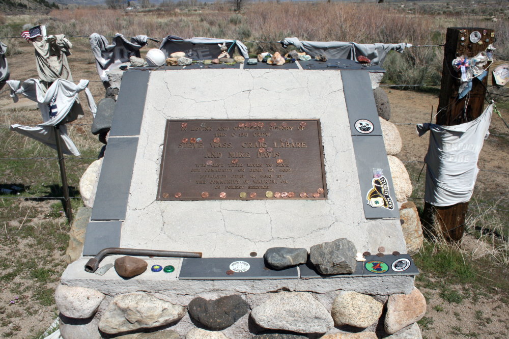 On the way back down south we make a few stops, as promised to the kid. First is the memorial in the nearby town to the crew of a firefighting plane that crashed years ago, it's interesting to see what people have left--firefighters, airplane manufacturing employees and police officers like to leave pins, stickers and T shirts. Other people like us also leave little rememberances.