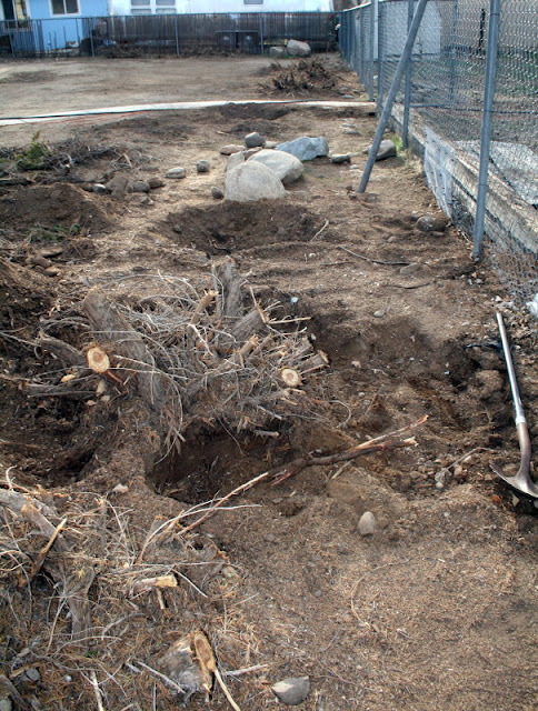 We even got the stump of the dead juniper pried out, thanks to a huge freakin' rock and a spare chain link post we found in the yard. Thanks Archimedes, yay for fulcrums/levers!